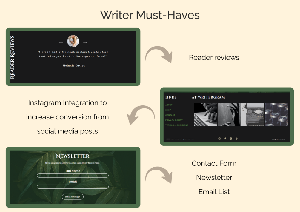 - Writer must-haves through reader reviews, newsletter/email list and Instagram integration;